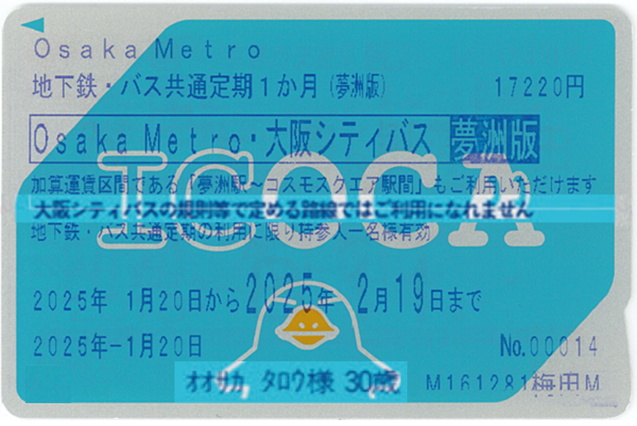 | 利用範囲 | Osaka Metro(※1)・大阪シティバス(※2)全線(※3) ※1 夢洲駅を除きます。 ※2 IKEA鶴浜行バス、その他大阪シティバスの規則(乗合自動車運送約款取扱規則別表第2)で定める特定の路線を除きます。 ※3 オンデマンドバスはご利用いただけません。  |