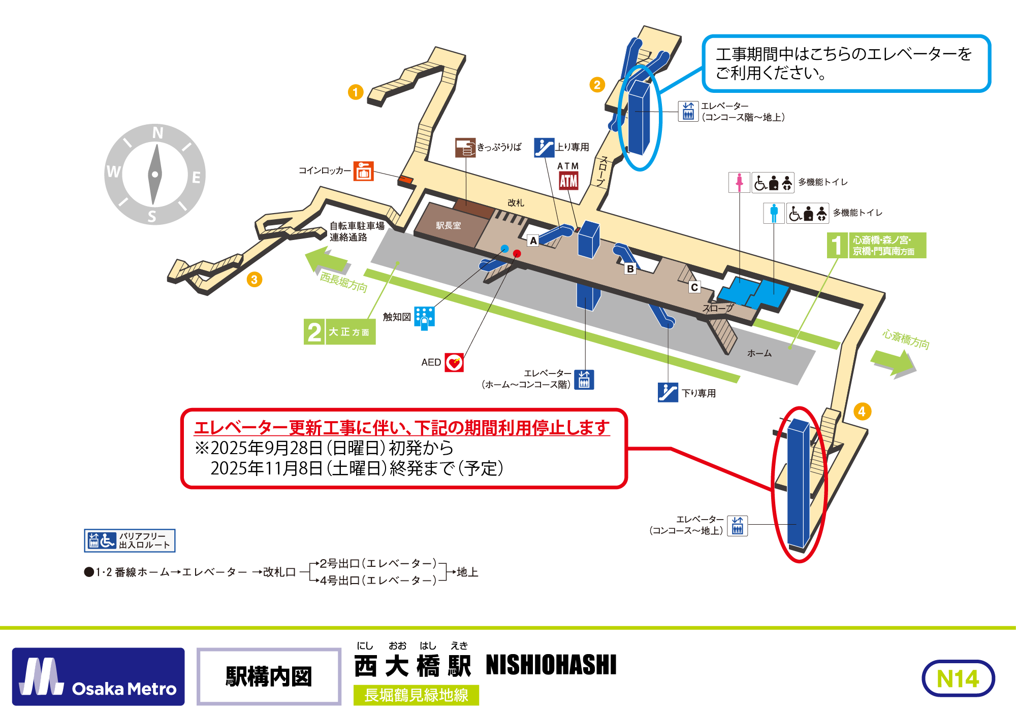 エレベーター更新工事に伴い、長堀鶴見緑地線 西大橋駅 エレベーター1基(4号出入口、改札階から地上階)を下記の期間利用停止します。