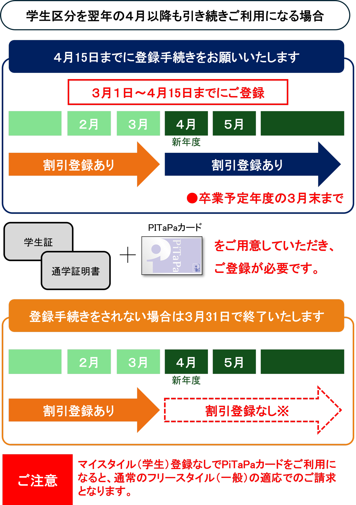 ⇒1年生の3月31日まで有効な通学証明書等で、2年生となる4月以降のご登録が可能です。