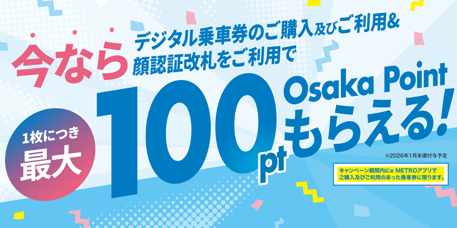 2025年10月14日(火曜日)から2025年12月31日(水曜日)の間に、e METROアプリで対象のデジタル乗車券をご購入かつご利用した方に、乗車券1枚につき最大100ポイントのボーナスポイントを進呈します!