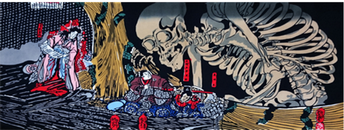 歌川国芳は山東京伝の『忠義伝』に取材した作品で、大宅光国と滝夜叉姫との対決の場面が三枚続の大胆な構図で描かれています。数百の骸骨をあえて一体の大きな骸骨に集約することで作品に凄みを与えています。海外、国内のアーティスト漫画家に影響を与えたと言われた作品です。