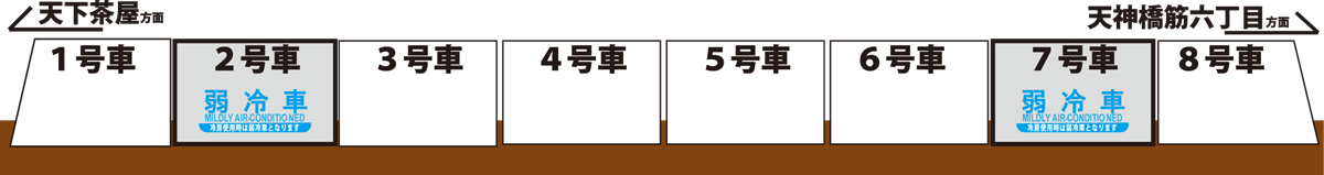 Osaka Metro 堺筋線では、これまで2号車・7号車を弱冷車として設定していましたが、今後も温暖化が進み高温傾向が続くことが予想される中、お客さまに快適な車内環境を提供するため、弱冷車の設定を2号車のみに変更します。