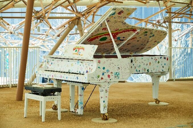 希望のピアノは、万博会場内「クラゲ館」で使用していたもので、0歳から120歳までの人たちが「こども」のように感性のおもむくままに遊び学び描いた約900体のクラゲのラッピングが施されています。