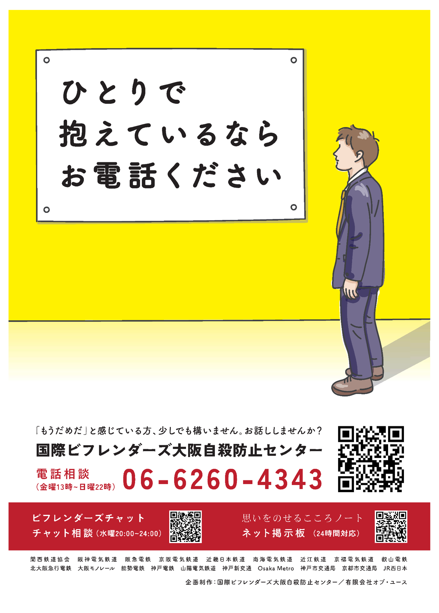 関西鉄道協会、関西の鉄道事業者18社局では、鉄道による自殺について、鉄道事業者として、その防止に取り組むため昨年度に引き続き、認定NPO法人国際ビフレンダーズ大阪自殺防止センターと共同で制作したポスターを2025年9月1日(月曜日)以降、駅に順次掲出します。