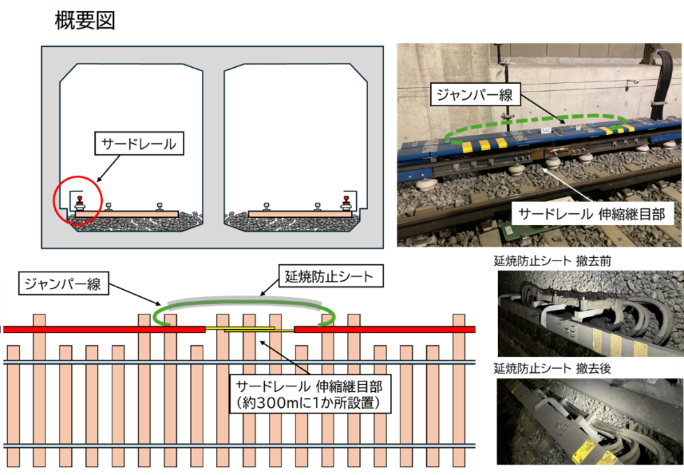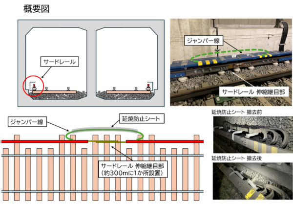 ◆ 原因特定を進めるなかで、サードレールの伸縮継目(寒暖差によるサードレールの伸縮を吸収する構造)部の電気の連結を行うジャンパー線に巻いている延焼防止シートを撤去して絶縁測定した結果、数値が向上し、再送電が可能となった。