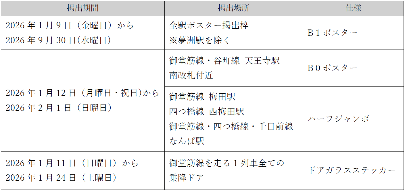 2026年1月10日(土曜日)から実施する地下街まつり(大阪地下街のOsaka Point提携店を対象としたキャンペーン)の開催に合わせ、Osaka Pointの認知および利用促進を目的に掲出します。Osaka Metro 駅構内および車内に掲出することで、駅直結の商業施設で開催されるキャンペーンへの気軽な参加を促します。