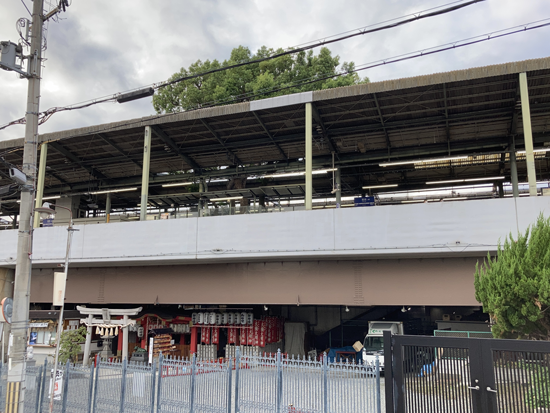 萱島駅の高架ホームを突き抜けた大きなくすのきが見られます。