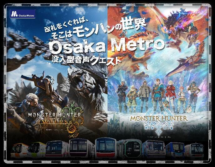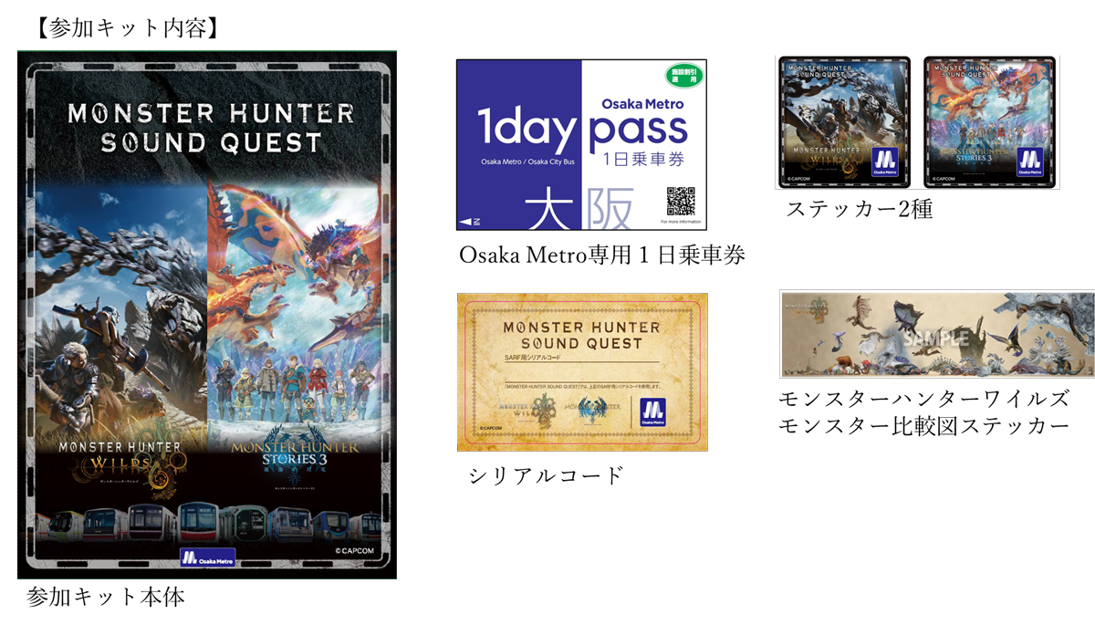 Osaka Metro では、モンスターハンターとタイアップし、2026年2月13日(金曜日)から2026年5月6日(水曜日・振替休日)まで「MONSTER HUNTER SOUND QUEST」を開催します。本イベントはOsaka Metro にご乗車いただき、音声ARを活用したデジタルクエストが楽しめるゲームイベントです。人気作「モンスターハンターワイルズ」と、モンスターハンターRPGシリーズ第3弾「モンスターハンターストーリーズ3 ~運命の双竜~」の2つの異なる世界がOsaka Metro の駅に音声ARで出現します。参加者は、専用の参加キットを購入し、Osaka Metro に乗って様々な音声ARスポットを巡ることでクエストをクリアすることができます。