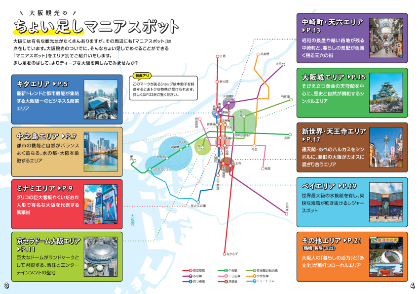 大阪をとにかくよく知っている、大阪愛では誰にも負けない、Osaka Metro ならではのお出かけサイト「オオサカマニア」。そんなオオサカマニアで紹介しているスポットの中から、観光地周辺のおすすめスポットを厳選しました。Osaka Metro 1日乗車券と一緒に持ち歩けば、大阪観光がもっと深く、もっと濃くなること間違いなし。さらに、本冊子を提示することでさまざまな特典も!観光スポットから少し足をのばして、“住んでいる人さえ知らない大阪”を発見する旅に出かけよう!
